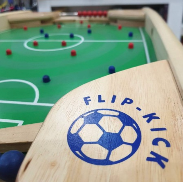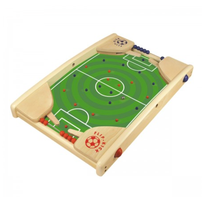 A two-player pinball style game. Each player use their spring-loaded flip-kick buttons to flick a ball through the opponent's goal.