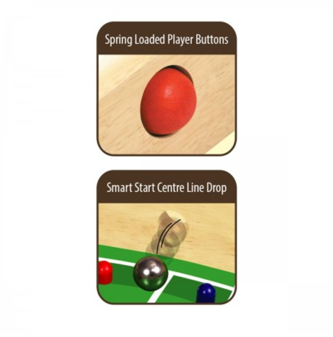 Start the game using a centre line Smart Start drop hole. One hole is set high above the playing field while other is set lower for a slower start. Press the right or left flip kick buttons to kick the ball forward or block an opponent's shot. Keep score using scoring abacus in front of each goal. Player with the highest score wins.