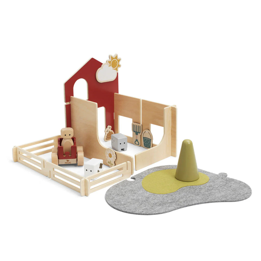 • Set includes: 4 walls, 1 figurine, 2 animals, 4 fences, 1 tree, 1 trailer, 6 magnets (sun, flower, pitchfork, poo, bucket and watering can) and a 2-part felt play mat